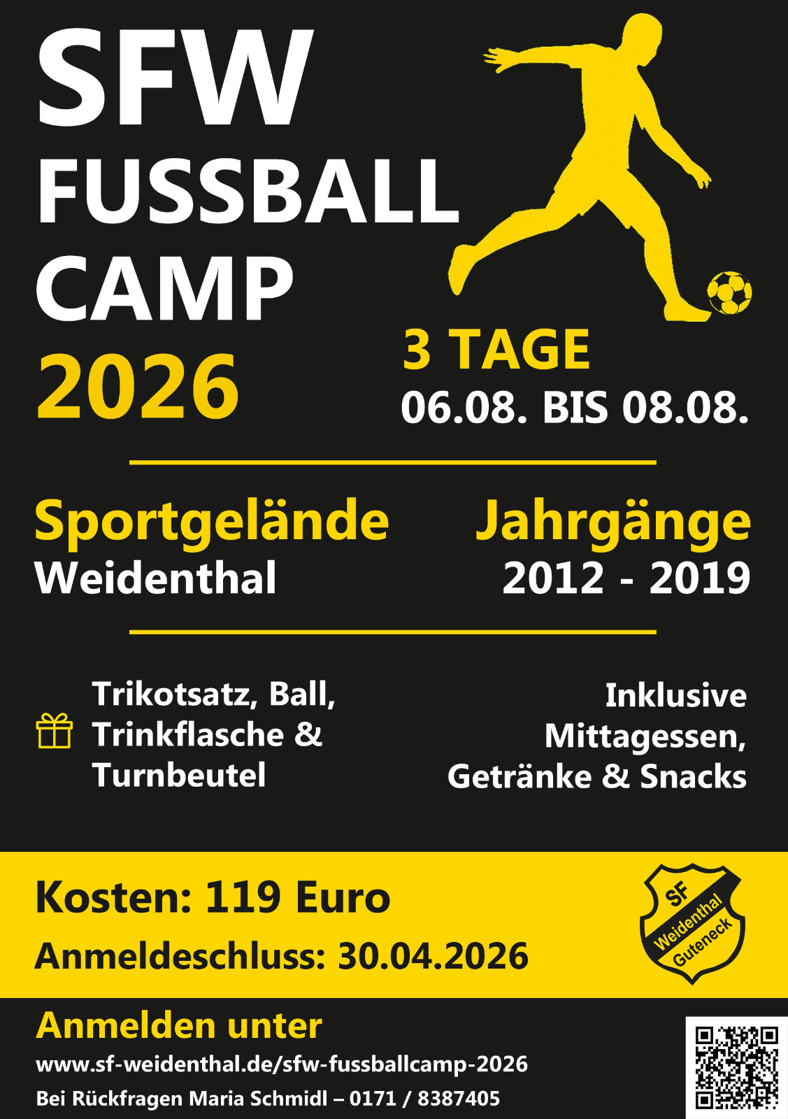 Vom 06.08.2026 bis 08.08.2026 findet unser SFW Fußballcamp auf dem Sportgelände Weidenthal statt!