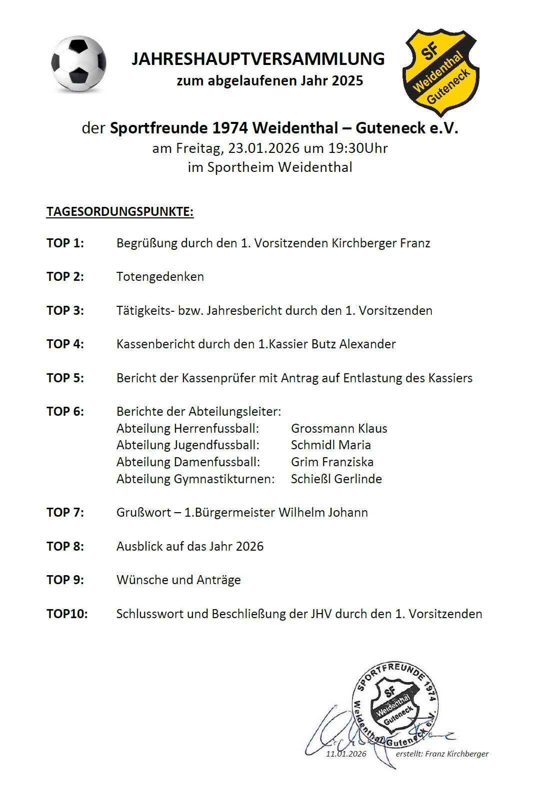 Die Sportfreunde 1974 Weidenthal–Guteneck laden herzlich zur Jahreshauptversammlung am 23. Januar 2026 um 19:30 Uhr ins Sportheim Weidenthal ein